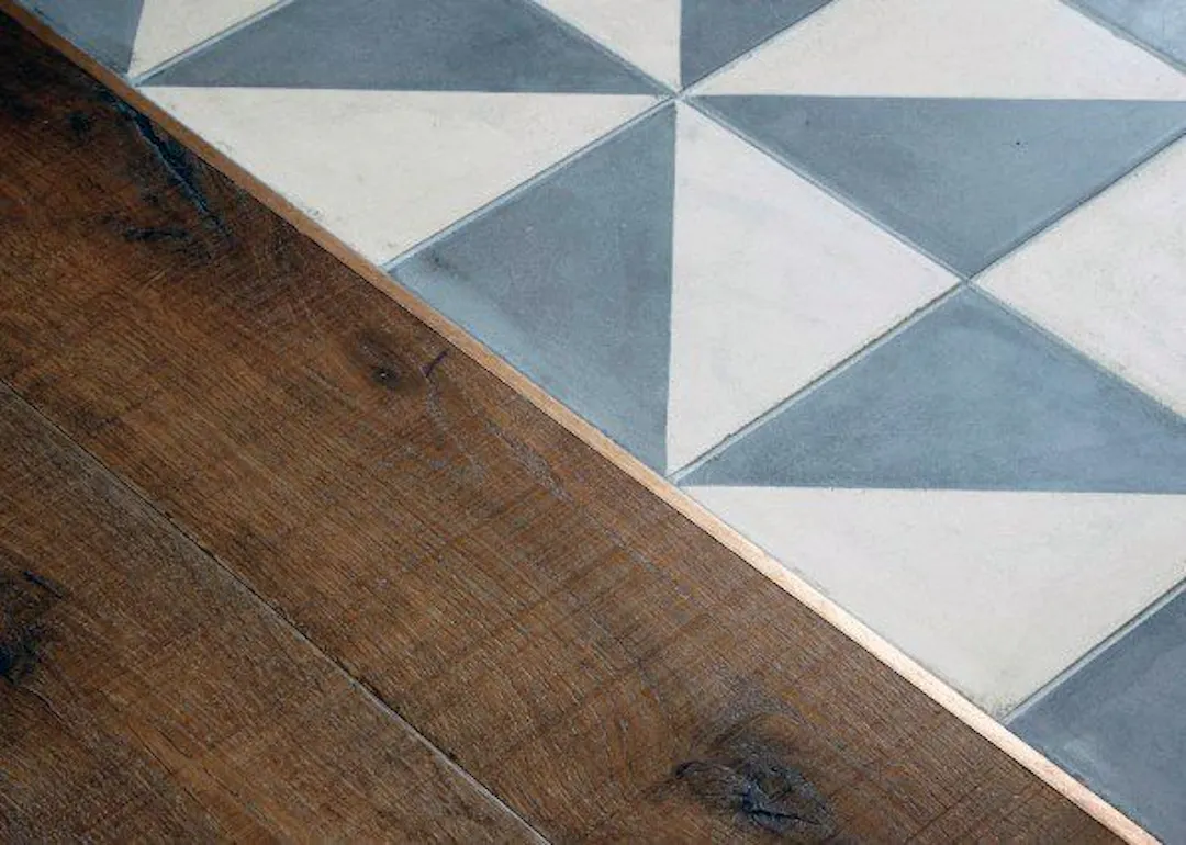 Detail of brass trim between wooden floor and tiles