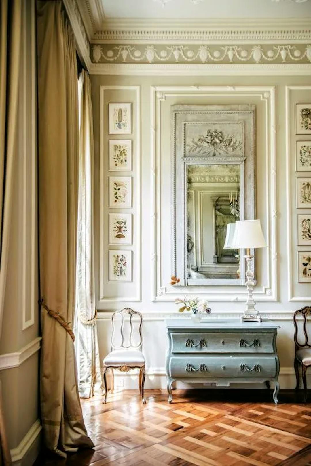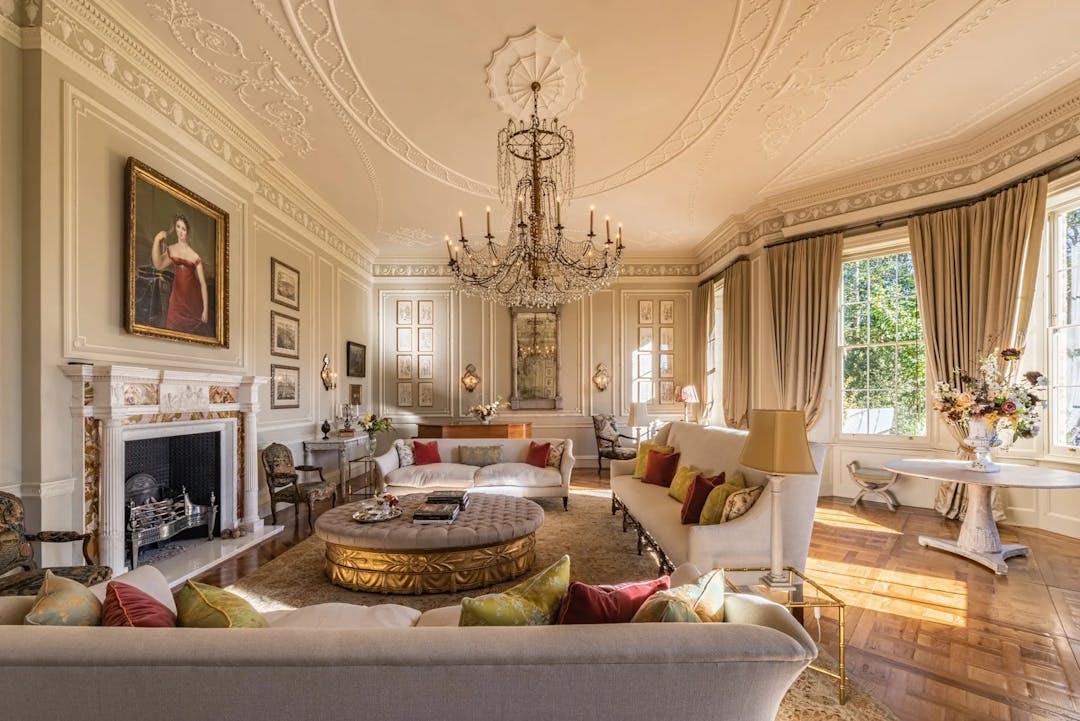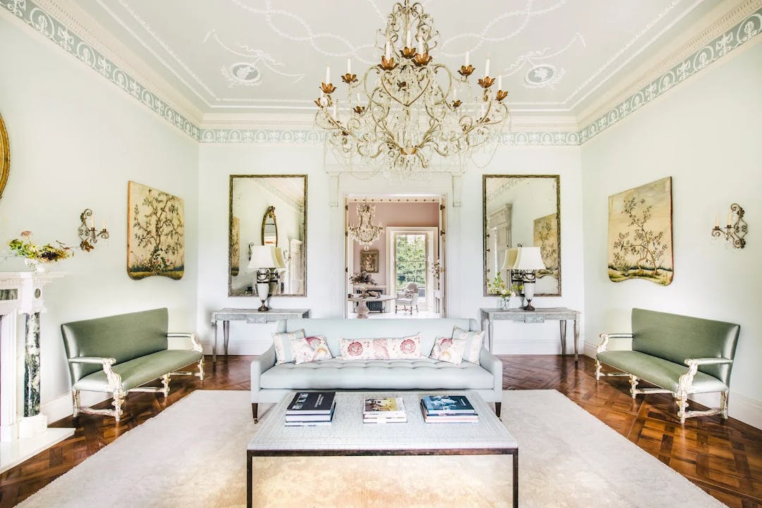 Delusions of grandeur set in when you step inside Templeton House, the 240-year-old Georgian Grade II listed mansion. The sprawling 28,000-square-foot property, is nestled in Roehampton, southwest London. The house was named after Lady Elizabeth Templeton, an artist, who first settled there with her husband in 1786, and was once the home of Winston Churchill. . It has served as a hospital during the First and Second World Wars, a dormitory for students at nearby Roehampton University, and later as a filming location for Downton Abbey. Now, following an almost decade-long £32 million restoration, the historic home has been restored to its former glory. “The challenge was making something look old, as if it had always been there,” says David Rich-Jones, who purchased the home with his wife, Laura, The 400-year-old oak wood flooring with was reimagined into Chantilly/ Versailles panels that were aged and treated to give them a vintage look.